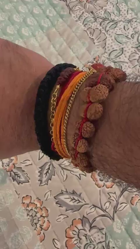 This limited edition bracelet has been intricately hand-knotted with vibrant red thread and carefully chosen Gauri Shankar Rudraksha beads, ensuring authenticity and potency. The pairing of multiple Gauri Shankar beads in one bracelet amplifies their power, creating a field of harmony that supports: